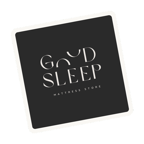 Black square sign with white border reading 'Good Sleep Mattress Store' on a pink background.